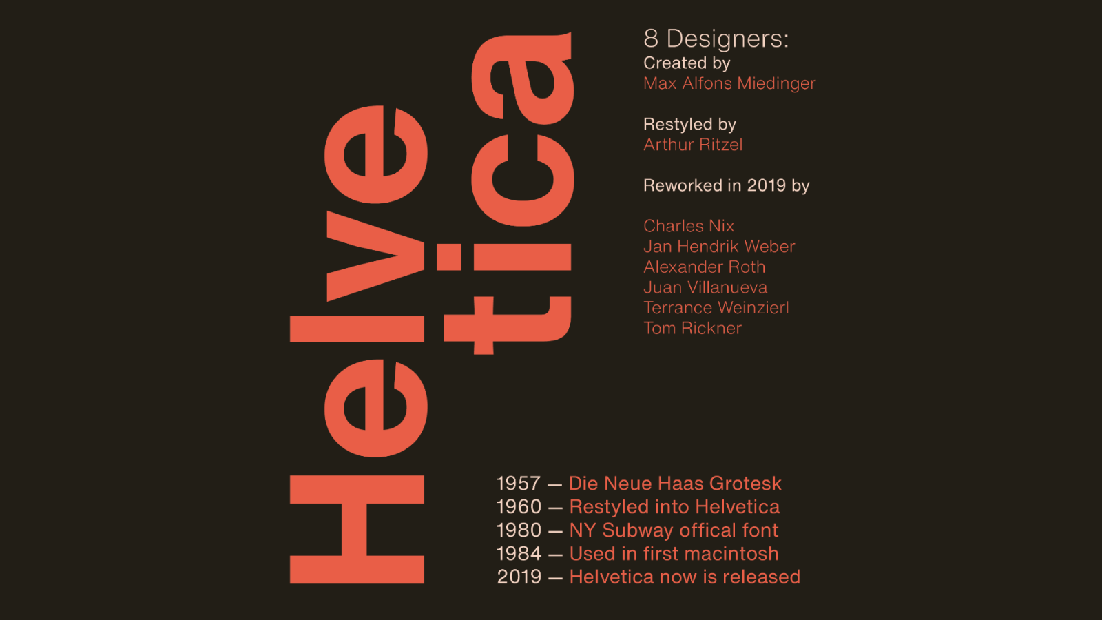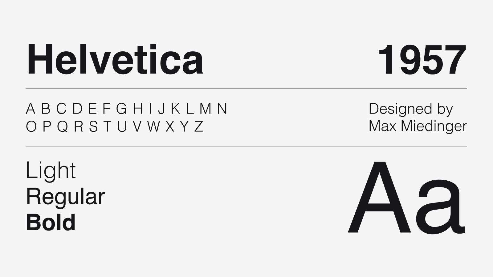 Кому-то 1957 год мог запомниться запуском советского спутника, кому-то выпуском первых в мире электронных наручных часов. Но для всех дизайнеров и типографов он, бесспорно, запомнился благодаря рождению уникального шрифта — Helvetica. Этот шрифт настолько известен и распространен, что о нем снят целый полнометражный фильм, который должен посмотреть каждый дизайнер. Мы рекомендуем!