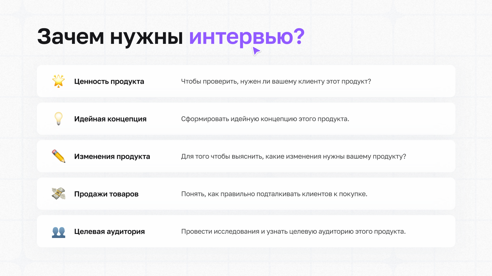 Цели проведения глубинного интервью могут быть разные: лучше узнать ЦА, востребованность продукта на рынке, сформировать идейную концепцию или понять, как подтолкнуть пользователя к покупке… Чтобы определиться, очень важно в самом начале задать себе вопрос, каких именно знаний не хватает для решения той или иной задачи. На основе этого мы формулируем четкие гипотезы, которые подтвердятся или опровергнутся в процессе интервью. Иногда гипотезы выдвигает сам клиент, или же они рождаются в процессе командного brainstorm. В любом случае, вам точно пригодится навык правильного построения гипотез. У нас на обучении есть целый урок на эту тему. Так что у вас будет возможность попрактиковаться и перенять опыт наших менторов, а также узнать ту самую секретную формулу, по которой строится любая гипотеза.